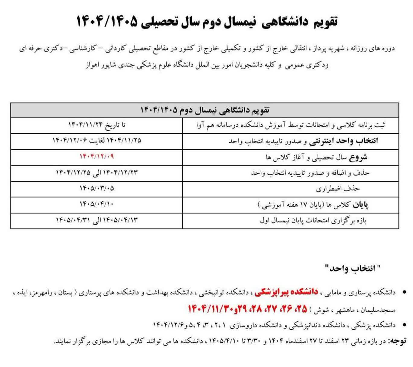 تقویم آموزشی نیمسال دوم 1405- 1404