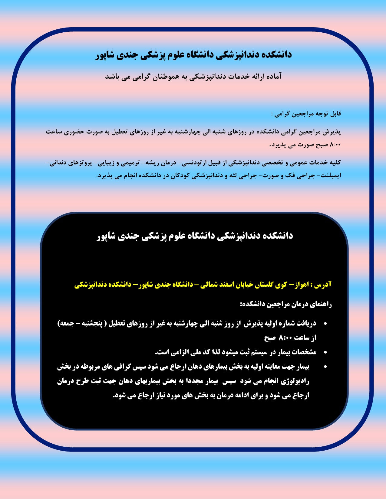 آدرس: اهواز ـ کوی گلستان ـ خیابان اسفند شمالی - دانشگاه جندی شاپور ـ دانشکده دندانپزشکی